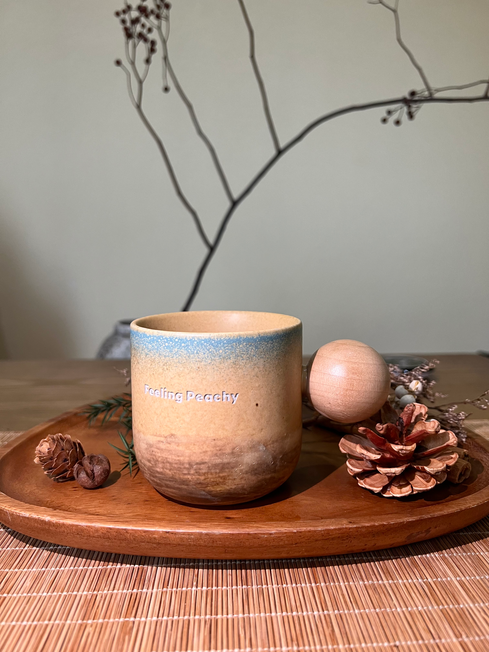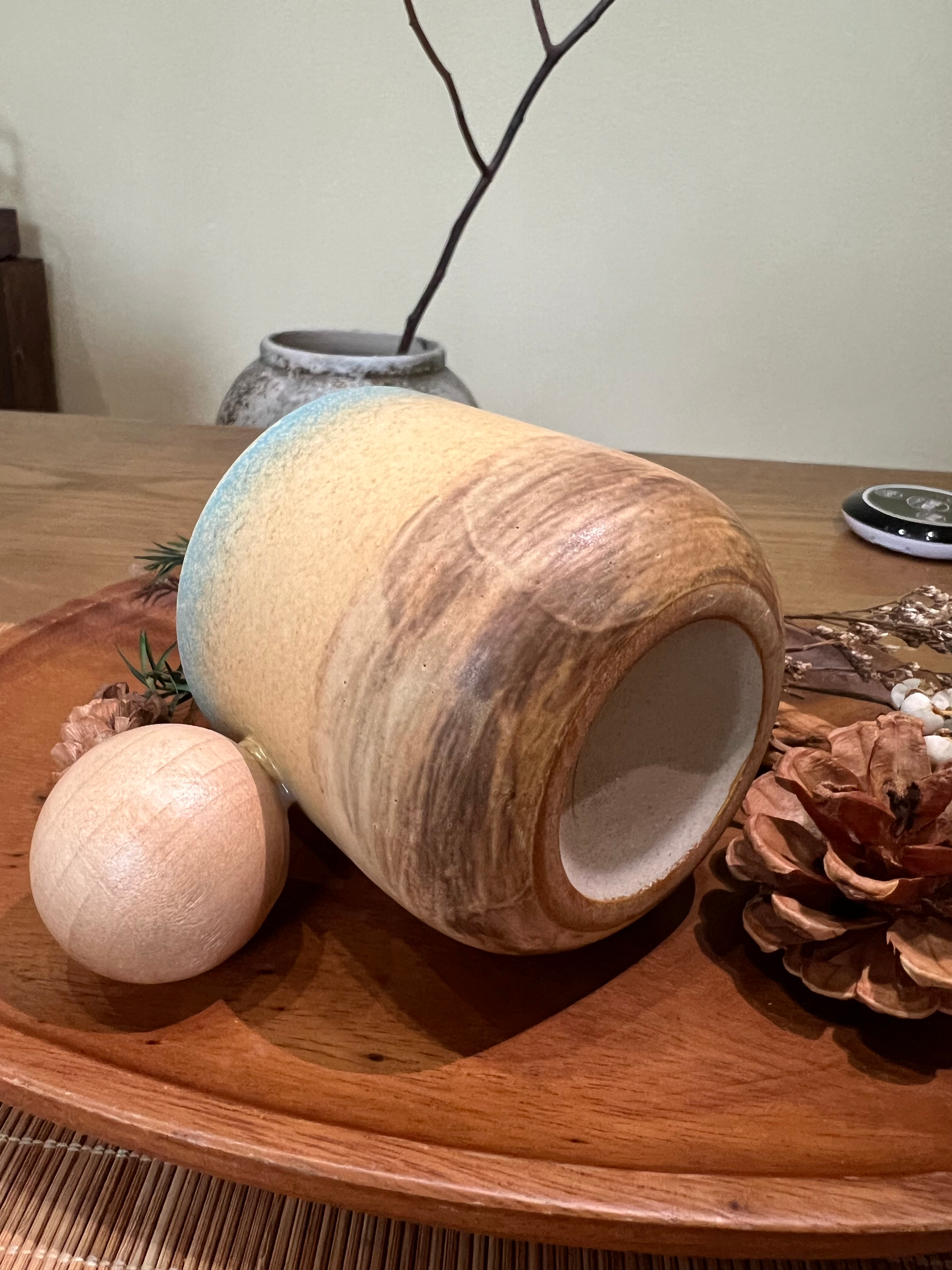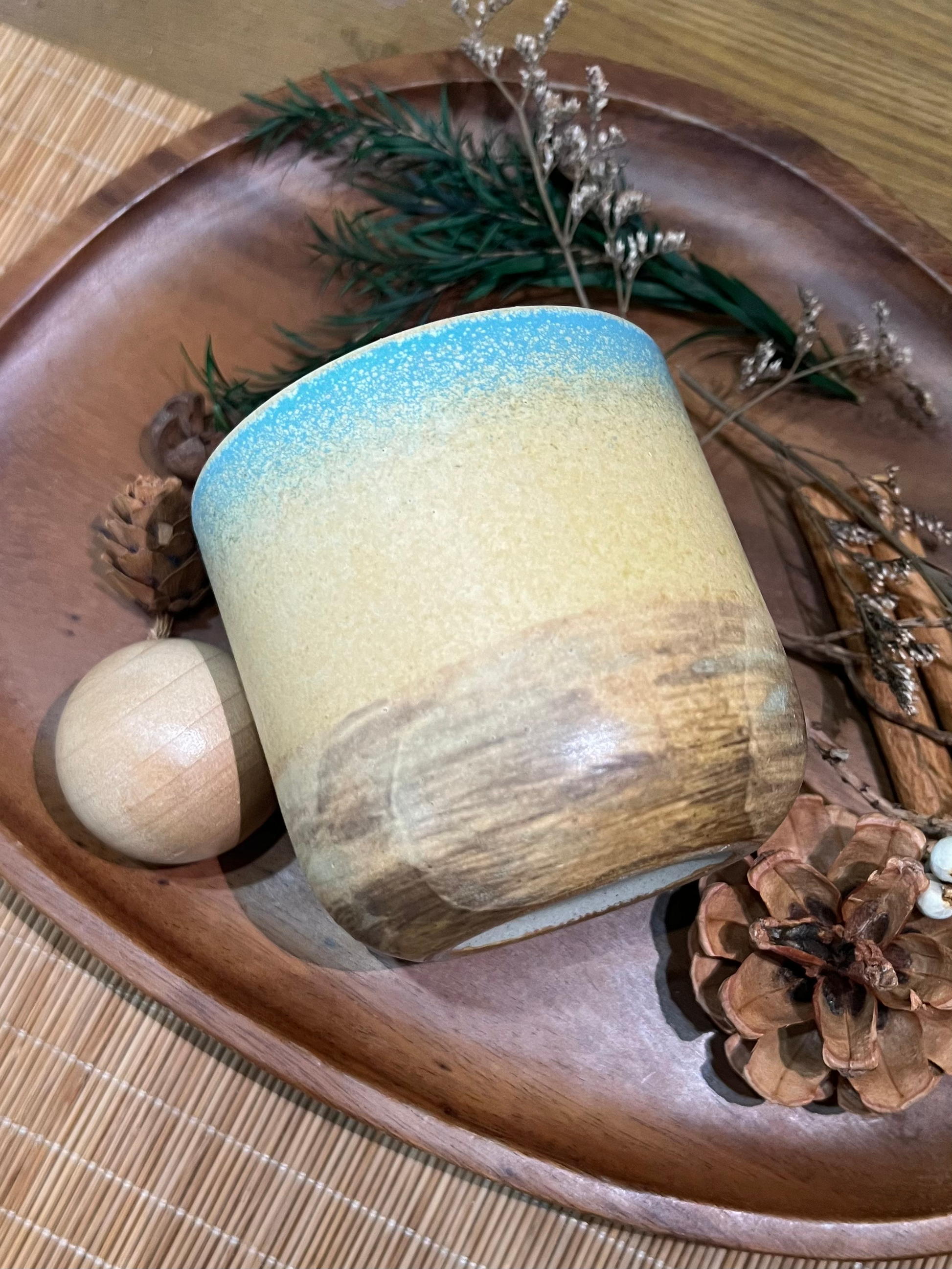 🎨 Color & Glaze 🎨 Inspired by a tranquil, natural palette, this cup features a stunning two-tone glaze. The bottom half is a warm, earthy tone with a rich, sandy texture, reminiscent of sun-baked clay. The top half contrasts beautifully with a speckled sky blue, creating a serene horizon line. Together, the colors evoke a peaceful, organic feel.