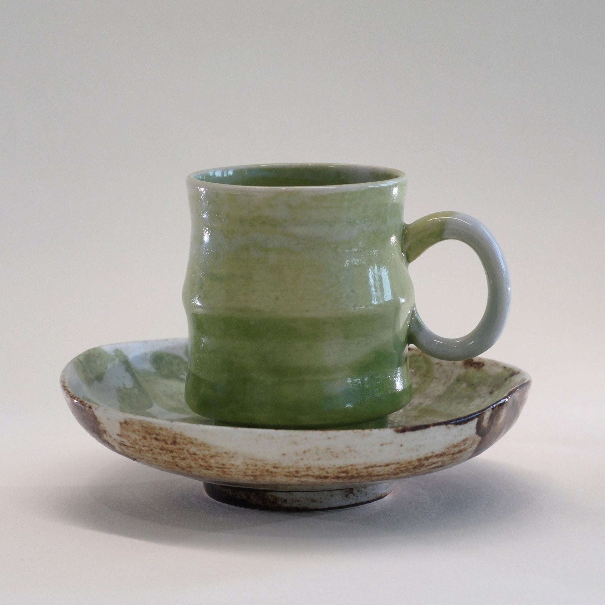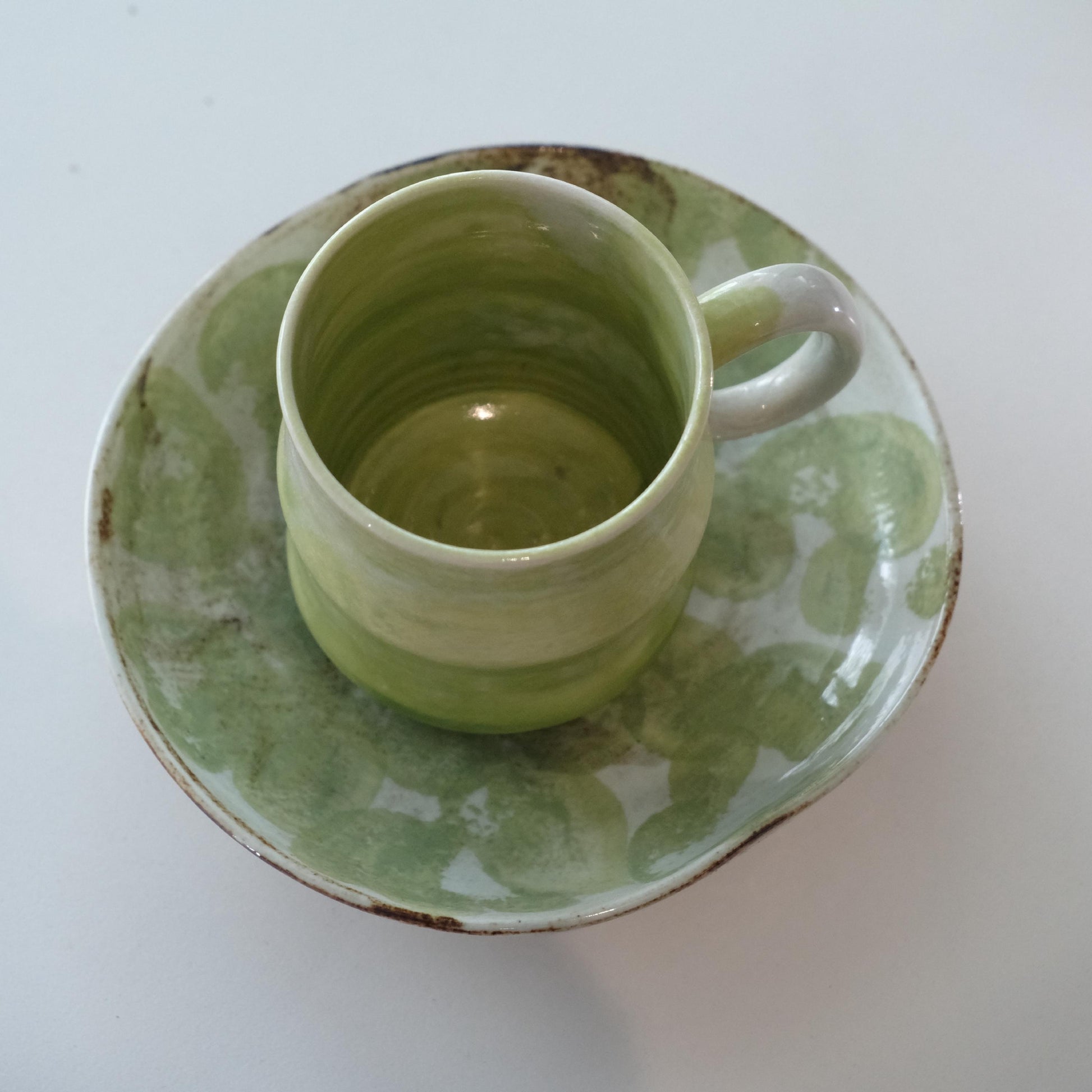 Cup Dimensions: Height: 2.8 inches (7 cm) Diameter: 2.4 inches (6 cm) Length (including handle): 3.5 inches (9 cm) The accompanying saucer complements the cup with its organic, slightly irregular shape and weighs about 8.8 oz (250g). It features a raised base, adding to its unique aesthetic.